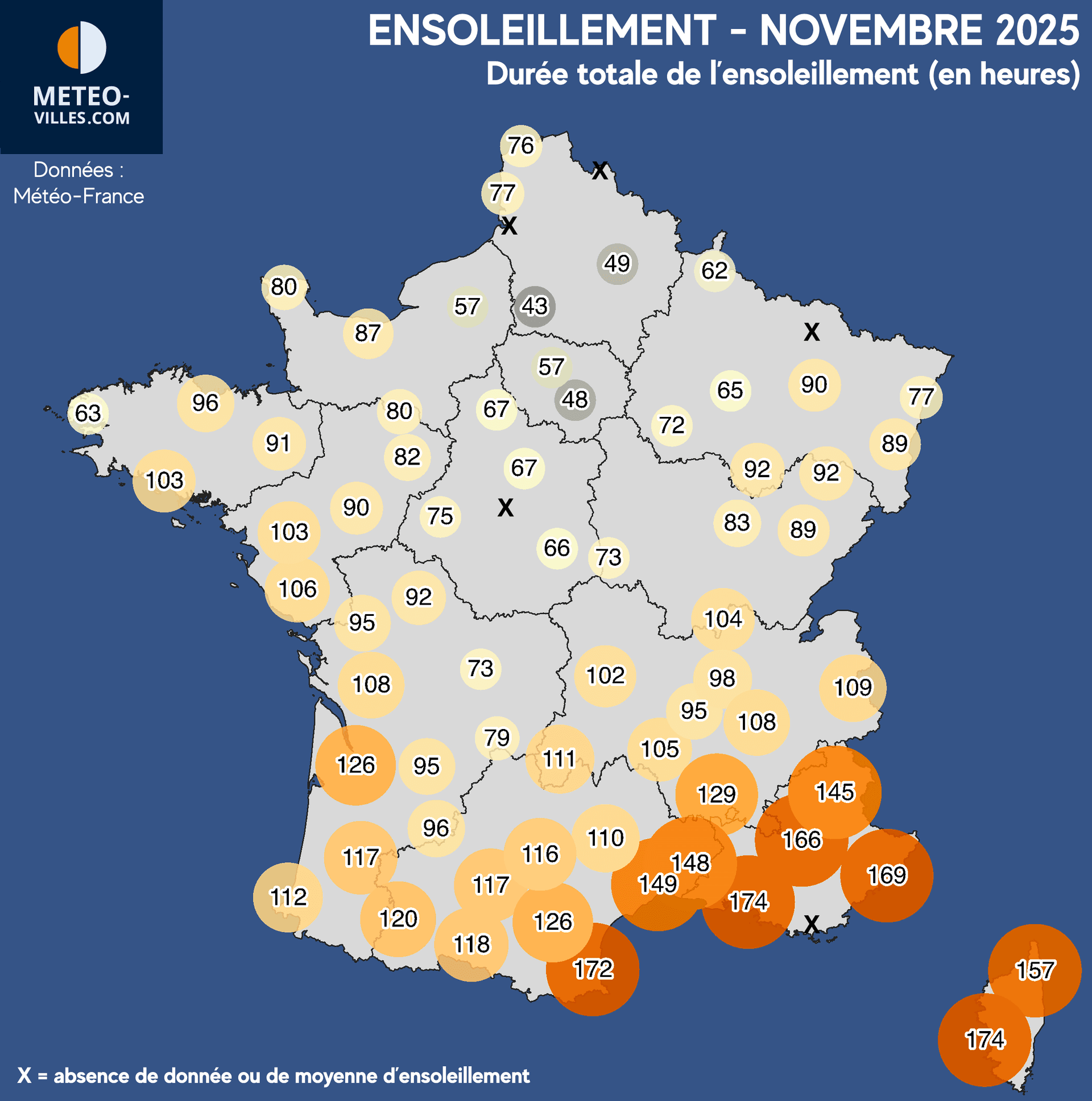 Carte des durée d'ensoleillement pour le mois de novembre 2025 en France - exclusivité Meteo-villes
