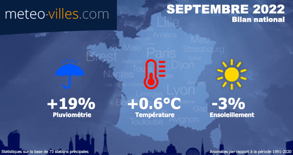 Traduit en termes de cumul, la moyenne approche les 80mm sur notre panel de stations contre une moyenne habituelle en septembre de 66mm. Il a davantage plu lors de ce mois que durant les 3 mois de l'été sur de nombreuses villes de notre pays. Les secteurs les plus servis en humidité sont situés sur la côte Basque (220mm à Biarritz), au nord de la Loire (122mm à Caen, 129mm au Touquet, 211mm à Calais), mais surtout en basse vallée du Rhône et Languedoc en raison des épisodes méditerranéens ayant enfin réduit la sécheresse dans ces villes (159mm à Nîmes, 189mm à Montélimar, 209mm à Montpellier).