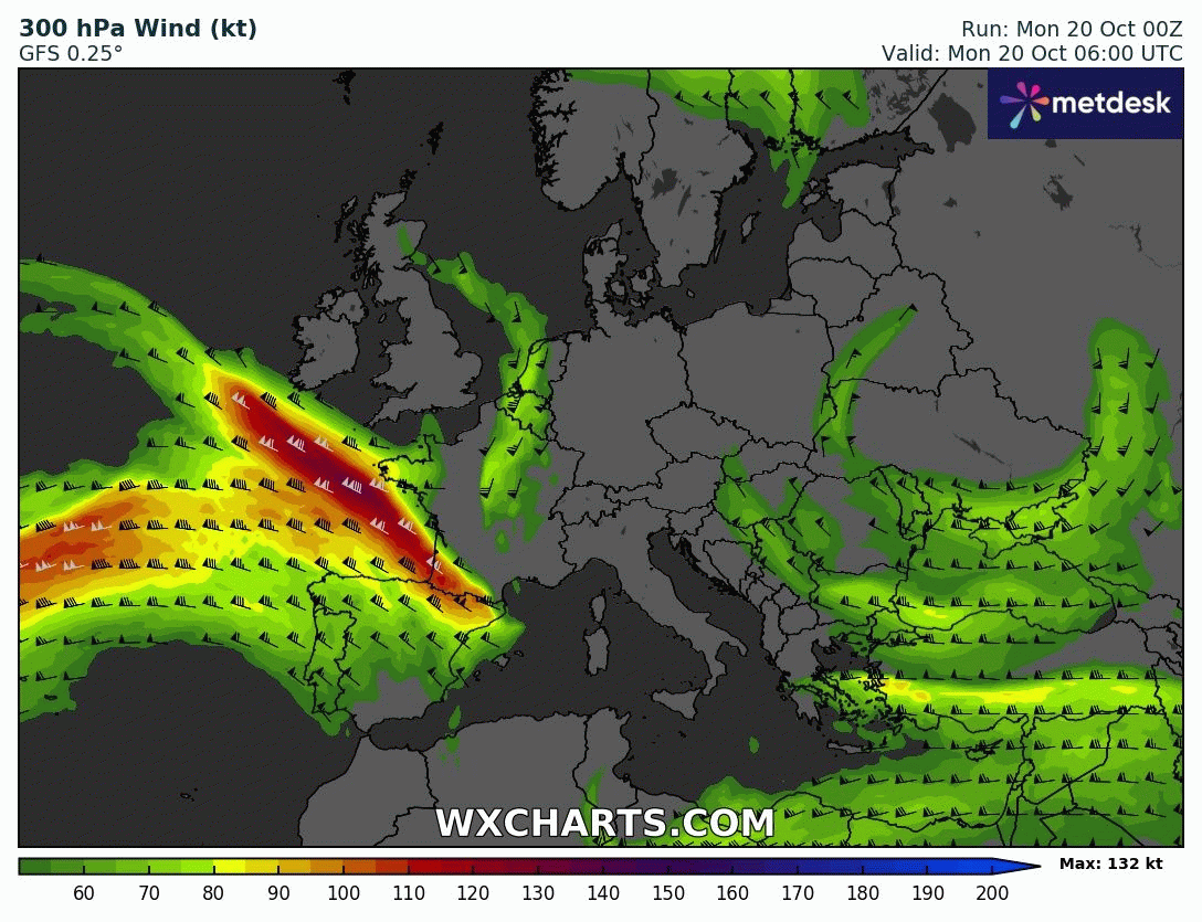 Évolution du courant jet sur l'Europe du 20 au 26 octobre 2025 – Modèle GFS via WX CHARTS