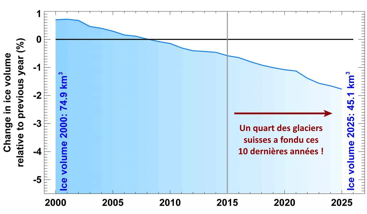 Le recul des glaciers est particulièrement important depuis le début du XXIème siècle. En Suisse, leur volume total représentait près de 75 kilomètres cube en 2000 tandis qu'il n'est plus que de 45 kilomètres cube en 2025 ! Plus impressionnant encore, la baisse s'est accélérée au cours des dix dernières années. Entre 2015 et 2025, 25% du volume des glaciers suisses a fondu ! Un recul d'un quart de la masse des glaciers en seulement 10 ans est alarmant...