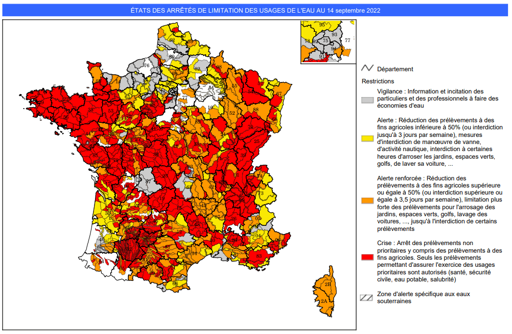 Carte des arrêtés de restrictions d'eau en France au mercredi 14 septembre 2022 - via Propluvia