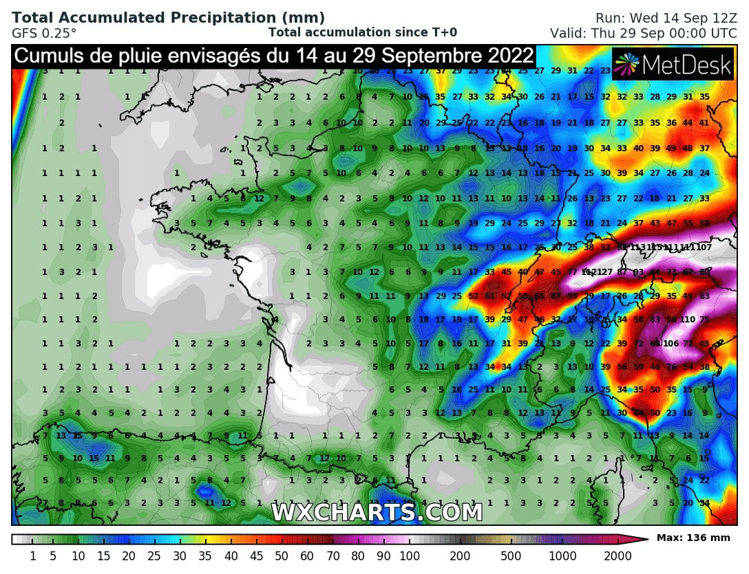 Modélisation des cumuls de pluie entre le 14 et le 29 septembre 2022 - modèle américain via wxcharts.com