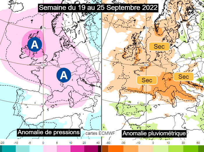 Anomalies de pressions et de pluviométrie pour la semaine du 19 au 25 septembre 2022 - via ECMWF