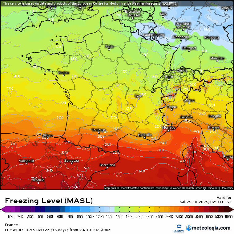 Altitude de l'isotherme 0°C du samedi 25 au lundi 27 octobre 2025 - meteologix.com