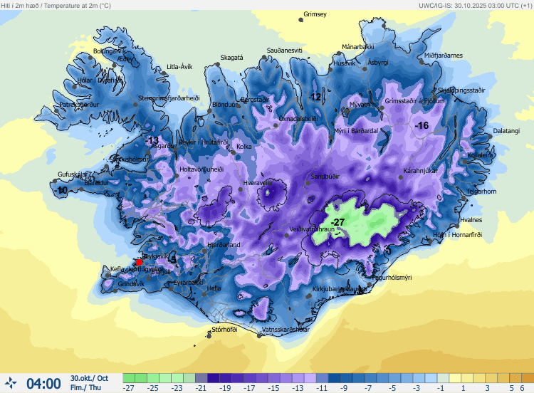 Avec le retour de nuits plus étoilées et des sols enneigés sur une grande partie du pays, l'Islande vit actuellement des nuits particulièrement froides. Ce matin du jeudi 30 octobre 2025, le thermomètre affiche -9°C à Reykjavik, une valeur qui se situe 10°C sous la normale d'une fin octobre (+1°C) ! Un peu plus dans les terres, à quelques kilomètres, des températures de -12 à -15°C sont enregistrées, descendant jusqu'à 15 degrés en dessous des normales de saison ! Toute l'île est en proie à un froid marqué avec jusqu'à -27°C dans les montagnes vers 2000 mètres.