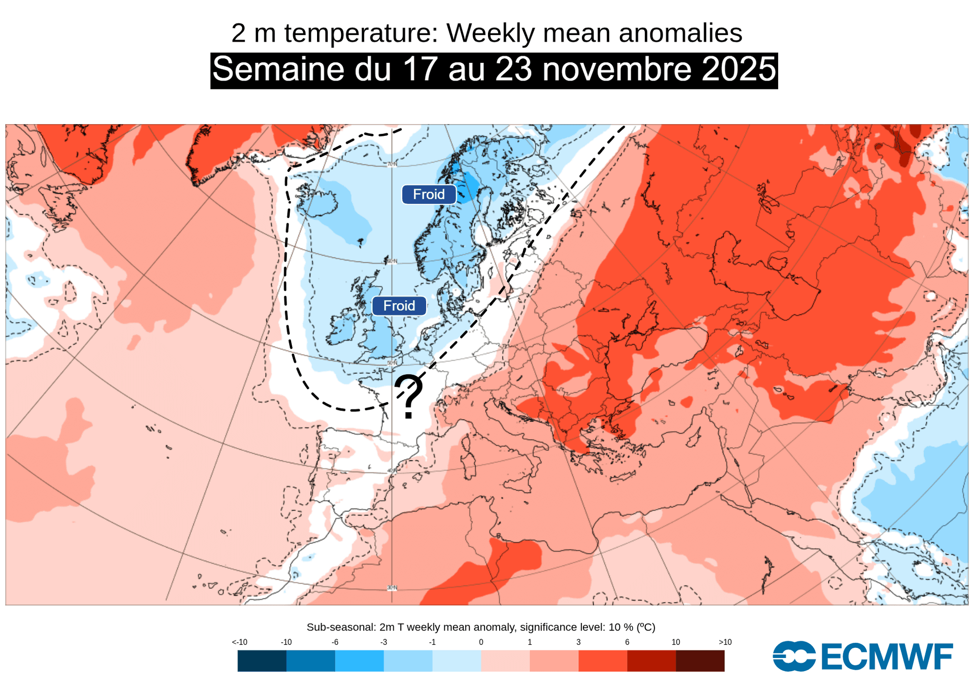 Ainsi, les températures vont repasser en-dessous des normales de la période la semaine prochaine sur une partie du continent européen, en témoigne la carte des anomalies de températures attendues pour la semaine du 17 au 23 novembre