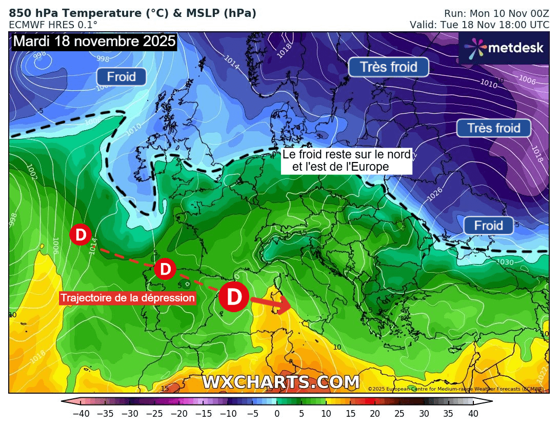 Cependant, si la zone dépressionnaire plonge plutôt vers la Méditerranée, alors le flux ne basculera pas vraiment au nord/nord-ouest et la masse d'air restera tout au plus assez fraîche avec des températures situées globalement dans les normales de la période (scénario du modèle ECMWF de ce lundi matin). Dans cette situation, la France subirait au contraire un courant océanique perturbé avec une succession de perturbations et des températures fluctuantes, sans véritables sensations de froid.