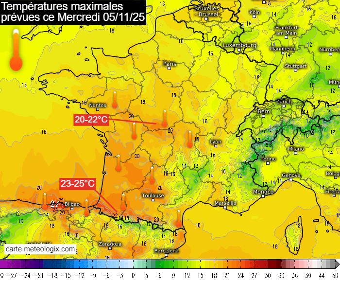 Si le début de semaine a déjà été doux, le pic de douceur est attendu ce mercredi 5 novembre 2025, à échelle nationale. Les températures vont atteindre les 18°C jusque dans le nord de la France et en région parisienne tandis qu'on prévoit autour de 22°C dans le sud de la région Centre, des niveaux 7 à 9°C au dessus des normales ! C'est encore au pied des Pyrénées qu'il fera le plus doux avec de nouvelles pointes de 25°C, voire localement un peu plus dans les vallées les plus exposées au foehn (loc. 26-27°C) !